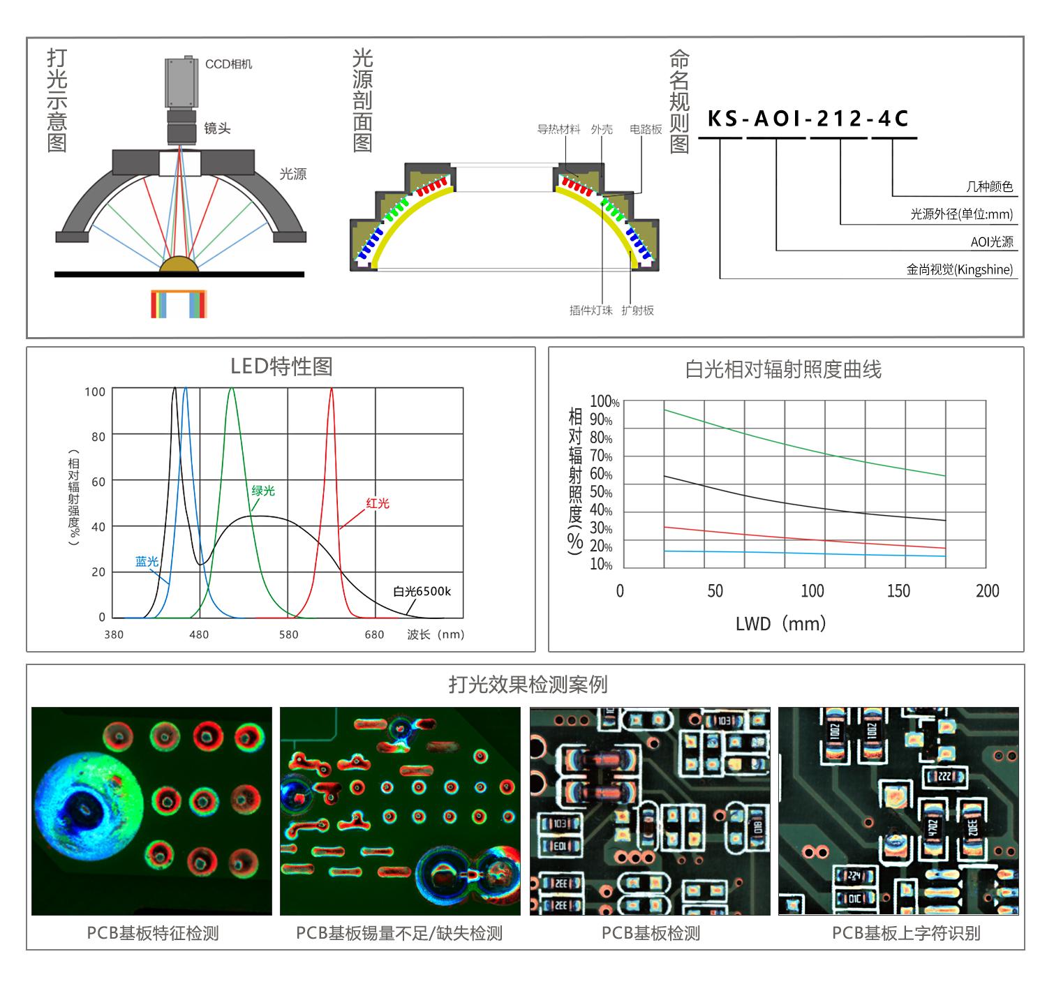 AOI系列光源采用紅綠藍三種顏色的高亮直插LED,分布成多種角度,并且可獨立控制,以達到在特定范圍內(nèi)實現(xiàn)顏色混合,能準確反應(yīng)物體表面立體信息。